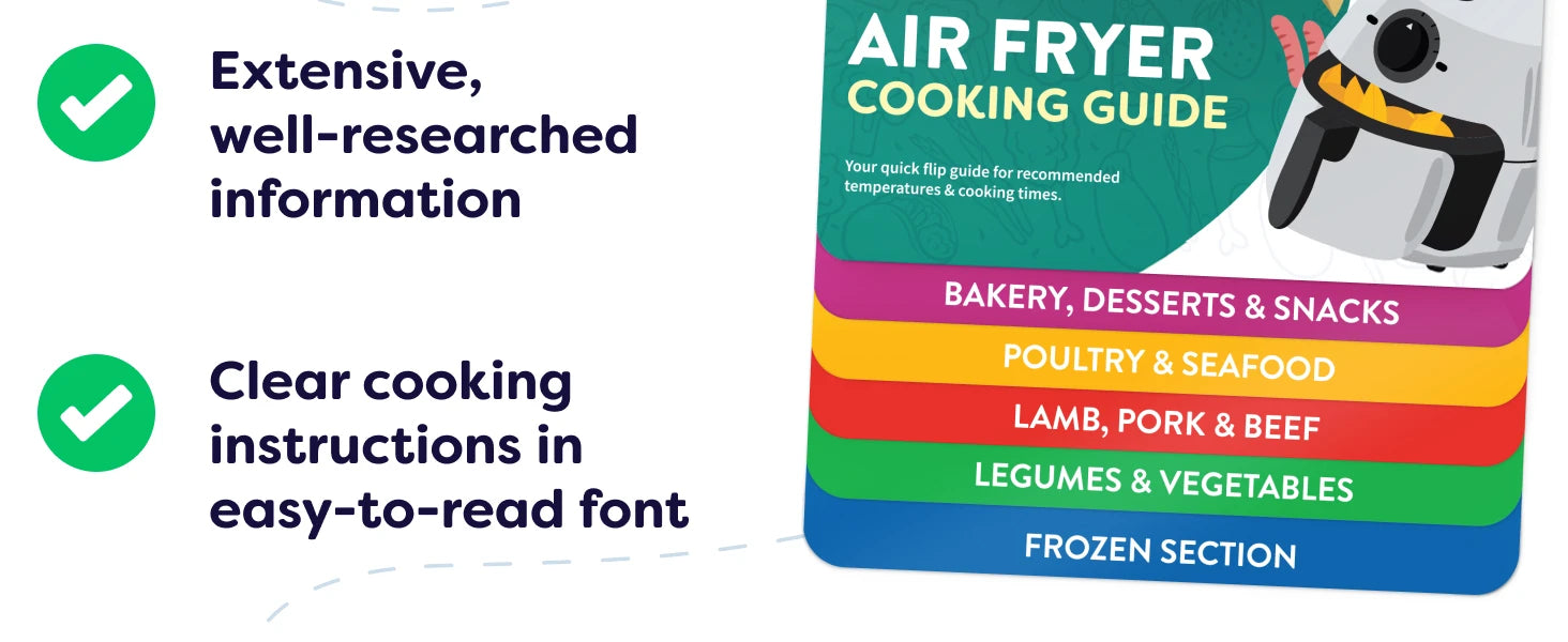 Air Fryer Accessories Magnet has over 120+ food entries conveniently organized into 5 airfryer categories. With clear cooking time instructions and temperatures in both Fahrenheit and Celsius. Food weights are displayed in ounces, pounds and inch-size. Instantly find ideal cooking times for anything you want to eat in just a minute, ensuring perfectly cooked food every single time.